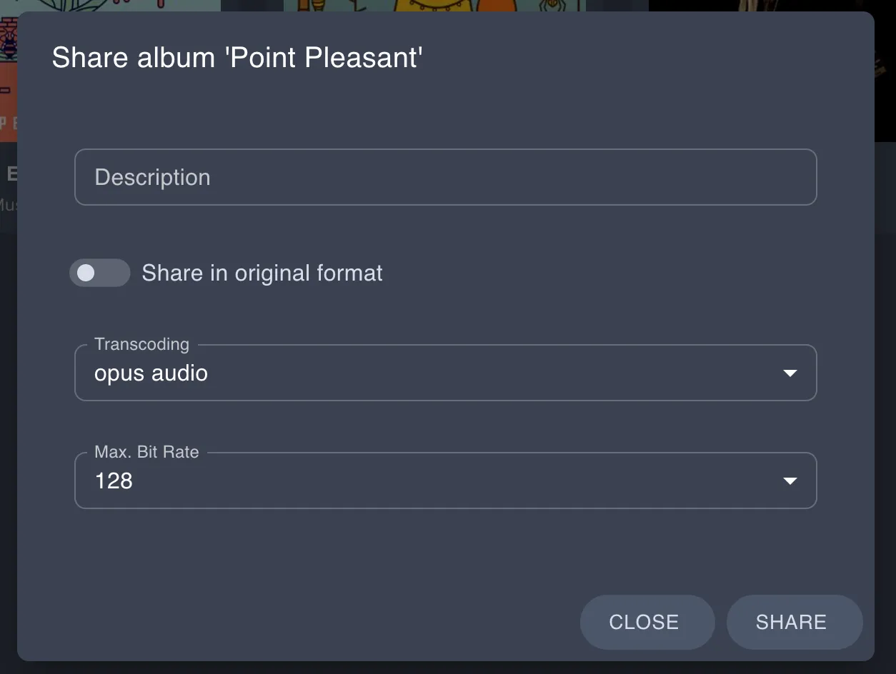 Once the Sharing feature is enabled, all users will be able to access current shares, modify descriptions and expiration, and create new ones. However, as of the initial implementation, there is currently no way to set permissions per user. When browsing your music collection, you will notice a “Share” button or menu item available for each item, be it a track, album, artist, or playlist. To share an item, simply click on this “Share” button.