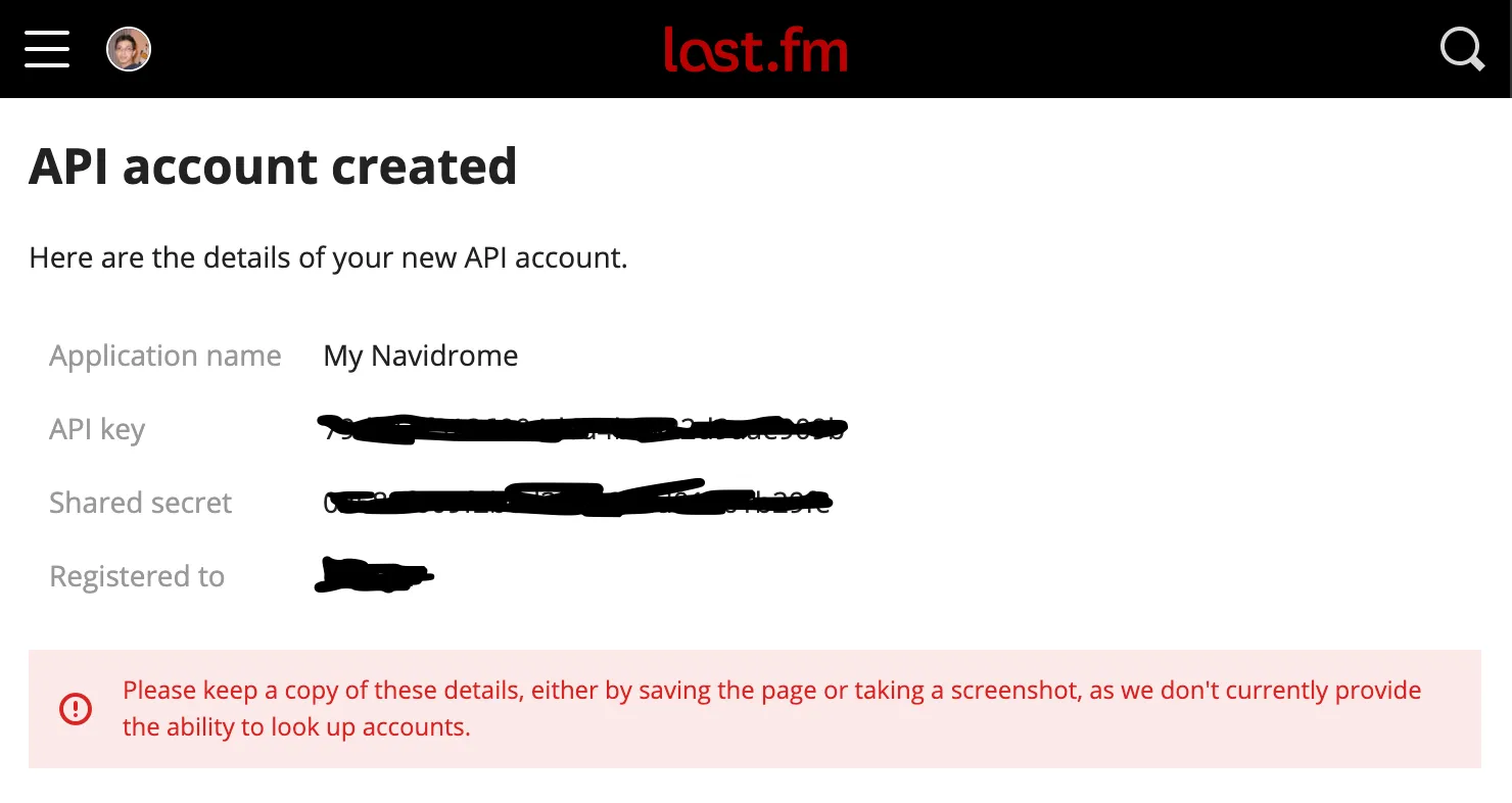 1. Copy the values above to your configuration file as LastFM.ApiKey and LastFM.Secret (or set them as environment variables ND_LASTFM_APIKEY and ND_LASTFM_SECRET)