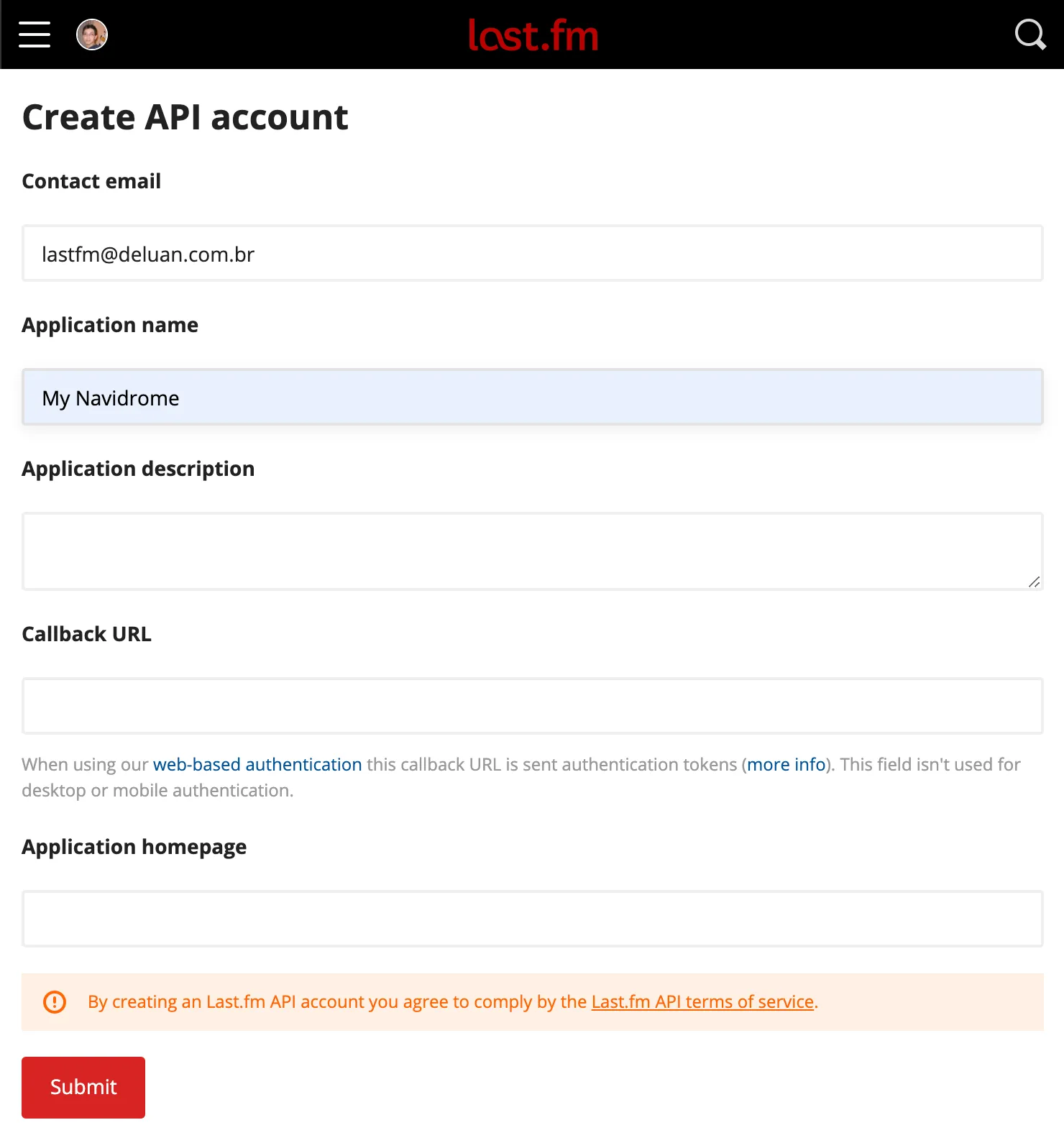 Navidrome can use Last.fm to retrieve artists biographies, top songs, similar artists and album covers. It can also send your scrobbles to Last.fm. For these features to work, you’ll need to set the config options LastFM.ApiKey and LastFM.Secret. You can obtain these values by creating a free API account in Last.fm: